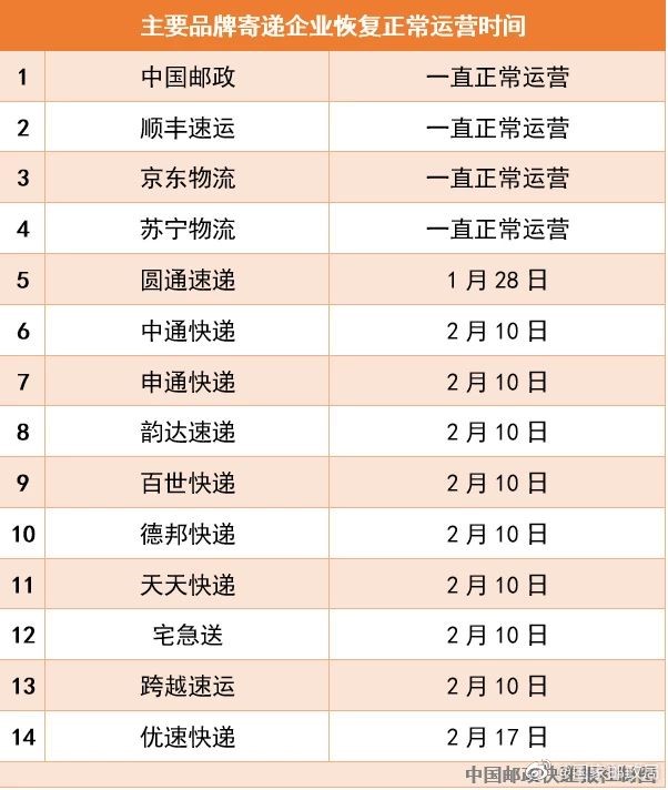 據(jù)國家郵政局消息,絕大部分主要品牌寄遞企業(yè)在2月10日恢復(fù)正常運營(可能存在地區(qū)差異,運營信息以當?shù)匚锪髌髽I(yè)公告為準)。